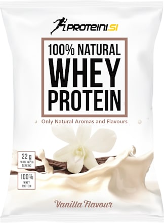 Proteini.si 100% naravne beljakovine sirotke Vanilija (Whey Protein) predstavljajo visokobeljakovinski koncentrat v prahu, z encimom laktaze in sladilom. Izdelek vsebuje mešanico koncentrata in izolata beljakovin sirotke, ki se uvrščata med najkakovostnejše beljakovinske vire, beljakovine pa so izjemno pomembne za normalno delovanje človeškega telesa ter za rast in vzdrževanje mišične mase. Proteini.si 100% naravne beljakovine sirotke so popolnoma brez dodanih umetnih sladil, arom in barvil.